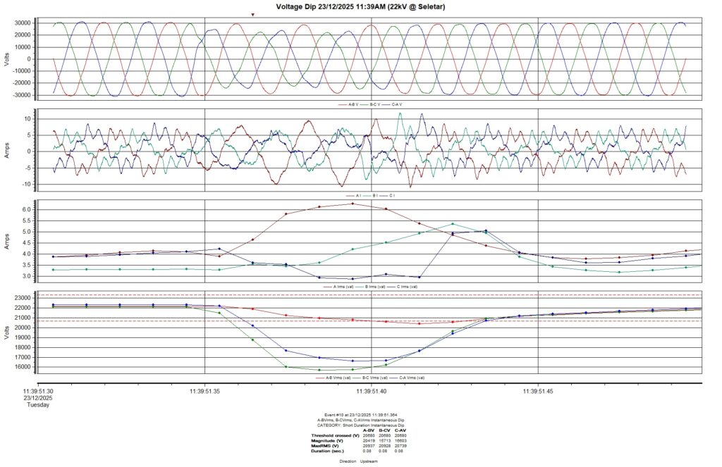 We were informed that it was a 22kV cable fault (faulted phases: L1 & L2) on an adjacent distribution network (i.e fault in another 22kV network, ‘connected’ to our measurement point via the 66kV network path).